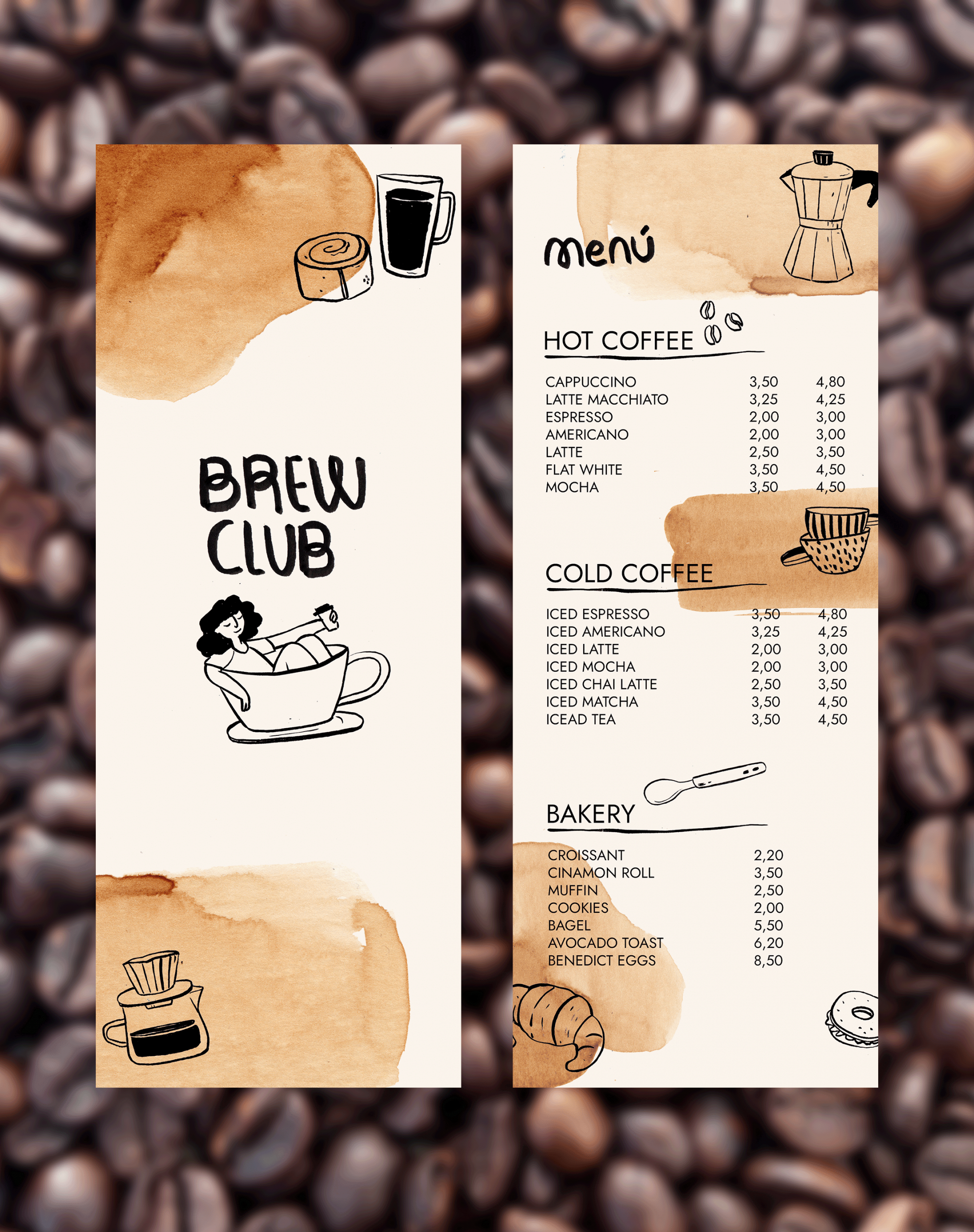 Este proyecto consistió en el diseño del menú para una cafetería y el resto de su identidad visual que buscaba transmitir una imagen cuidada, moderna y coherente con su espacio físico.